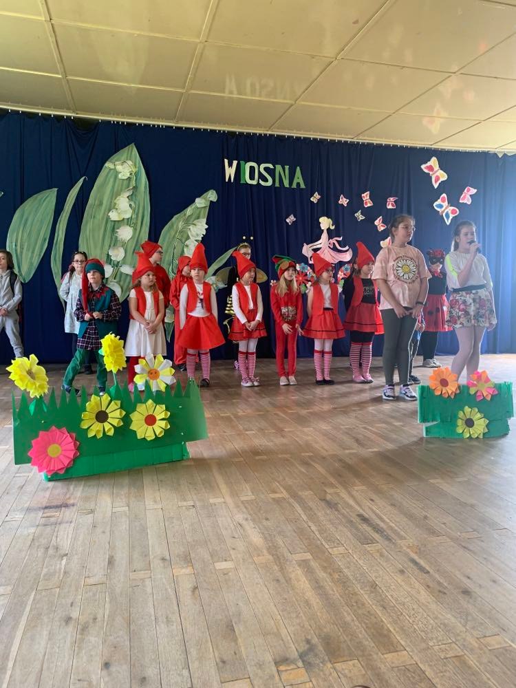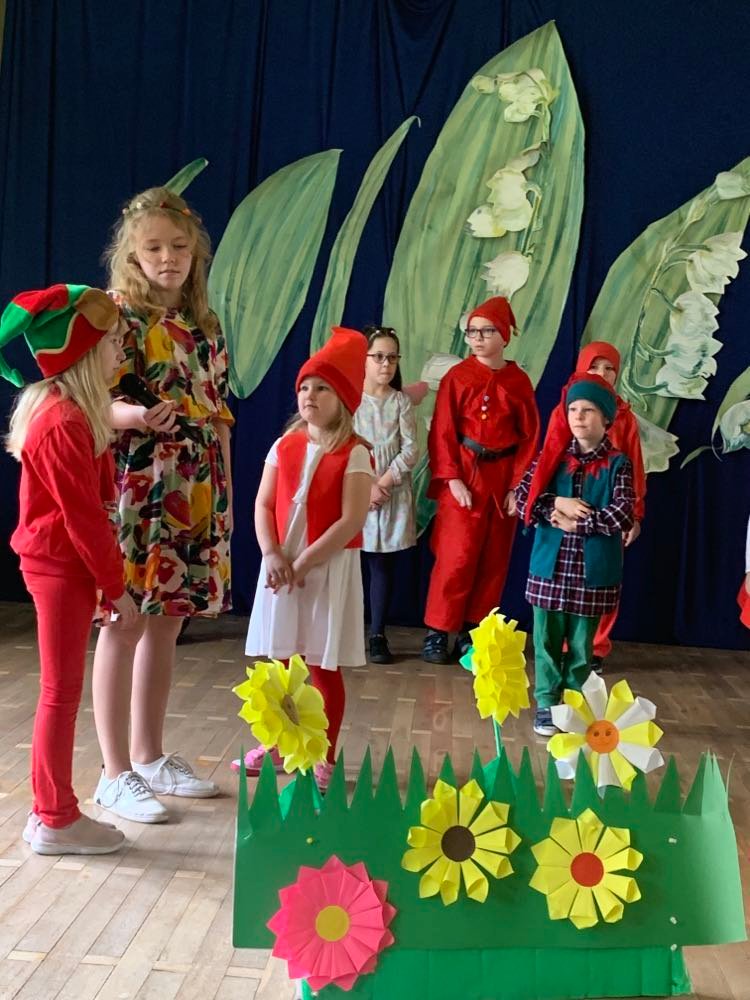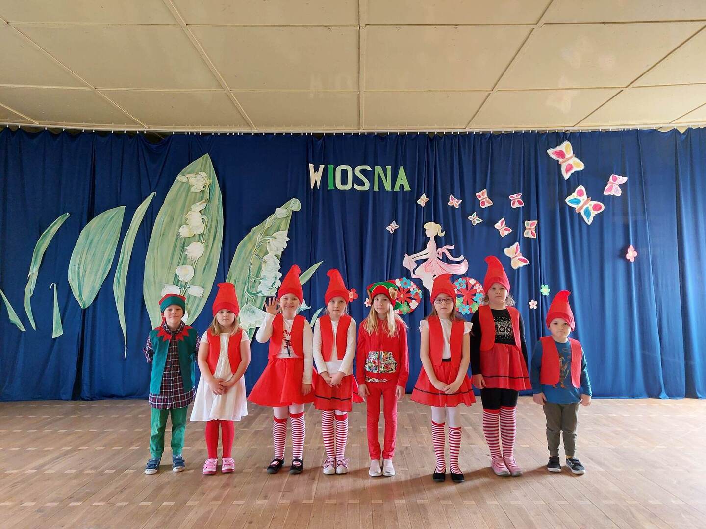 Z okazji przyjścia wiosny odbyło się przedstawienie przedszkolaków i klas młodszych ,,Jak krasnoludki pomagały Pani Wiośnie"