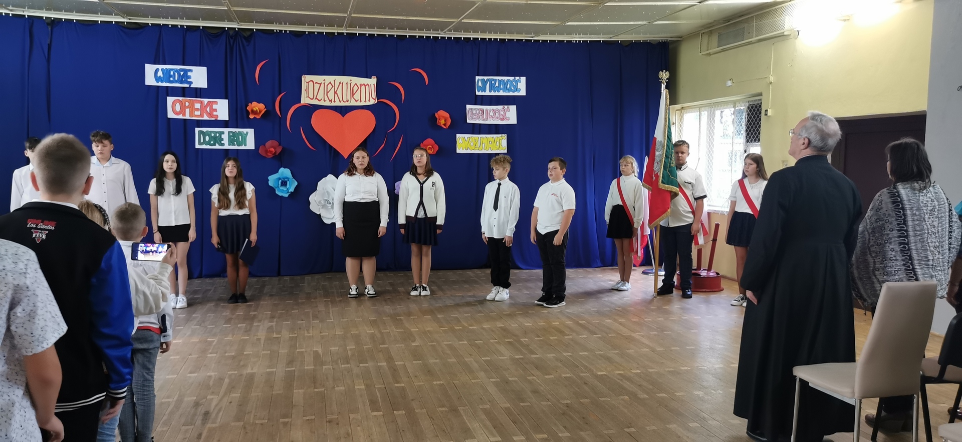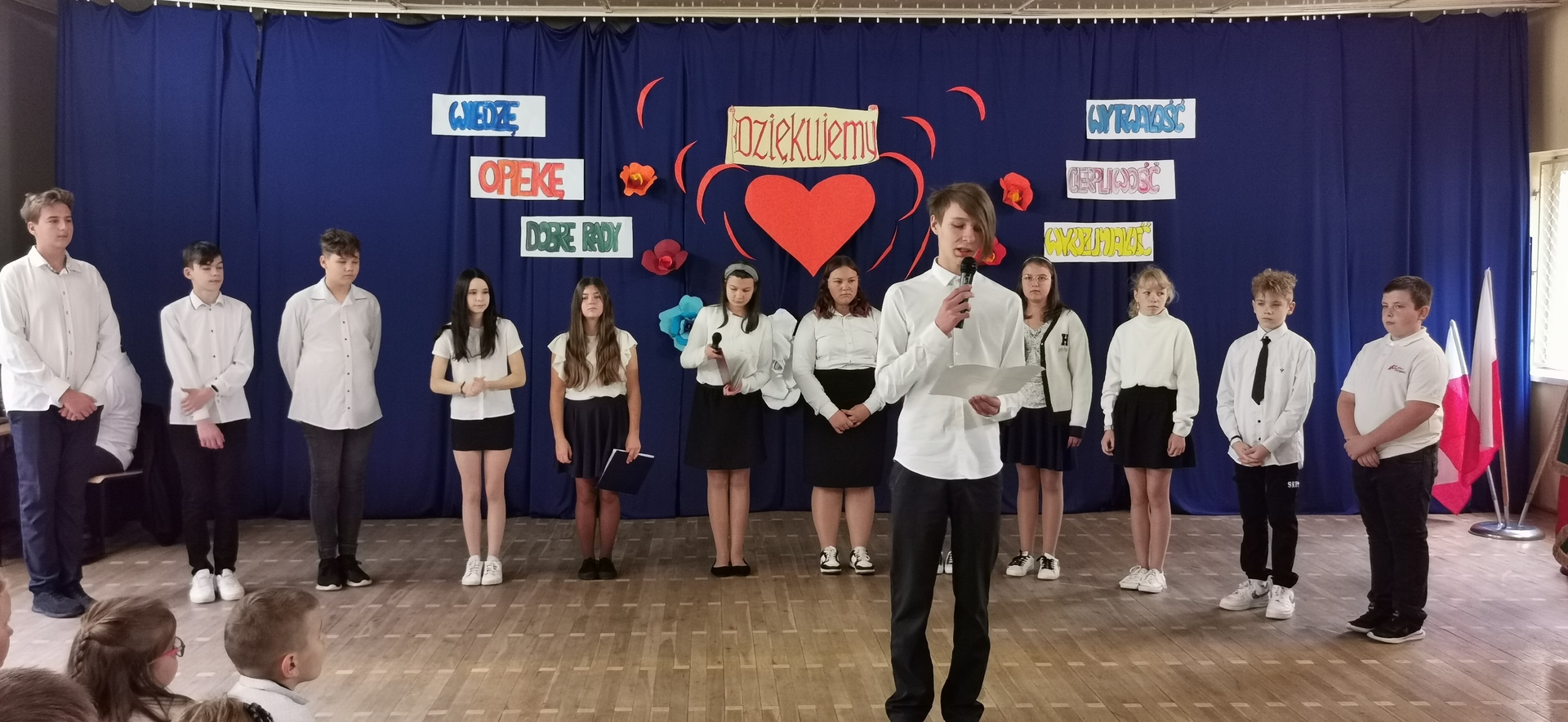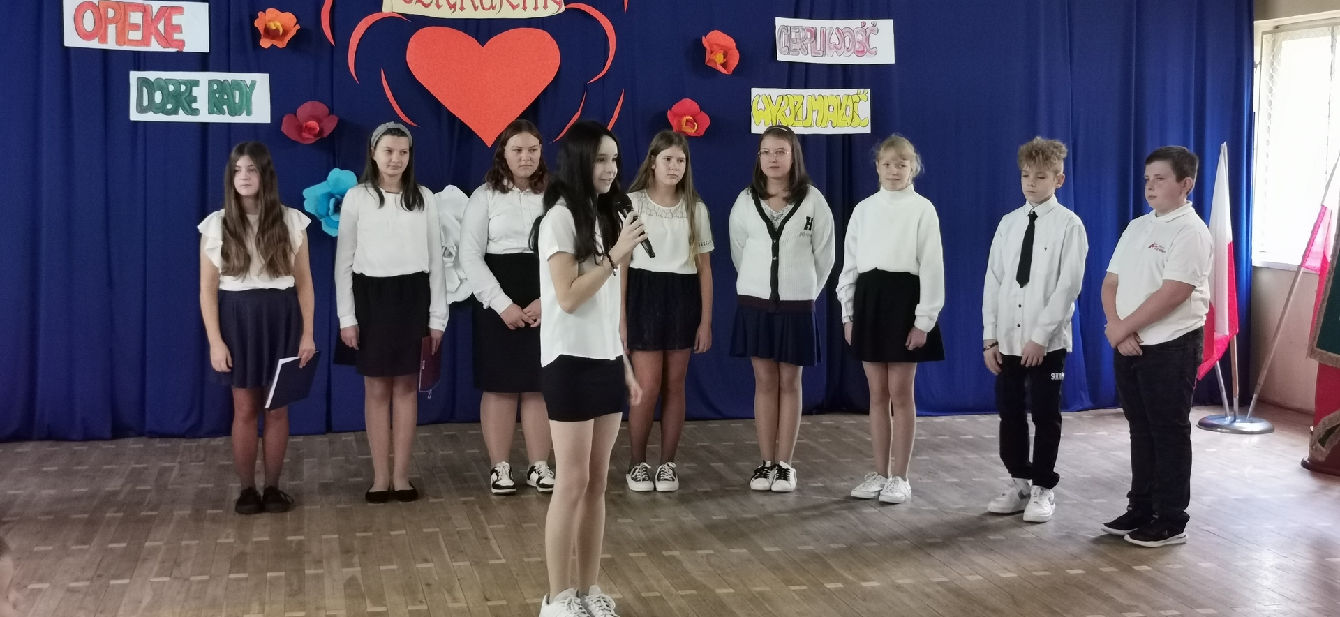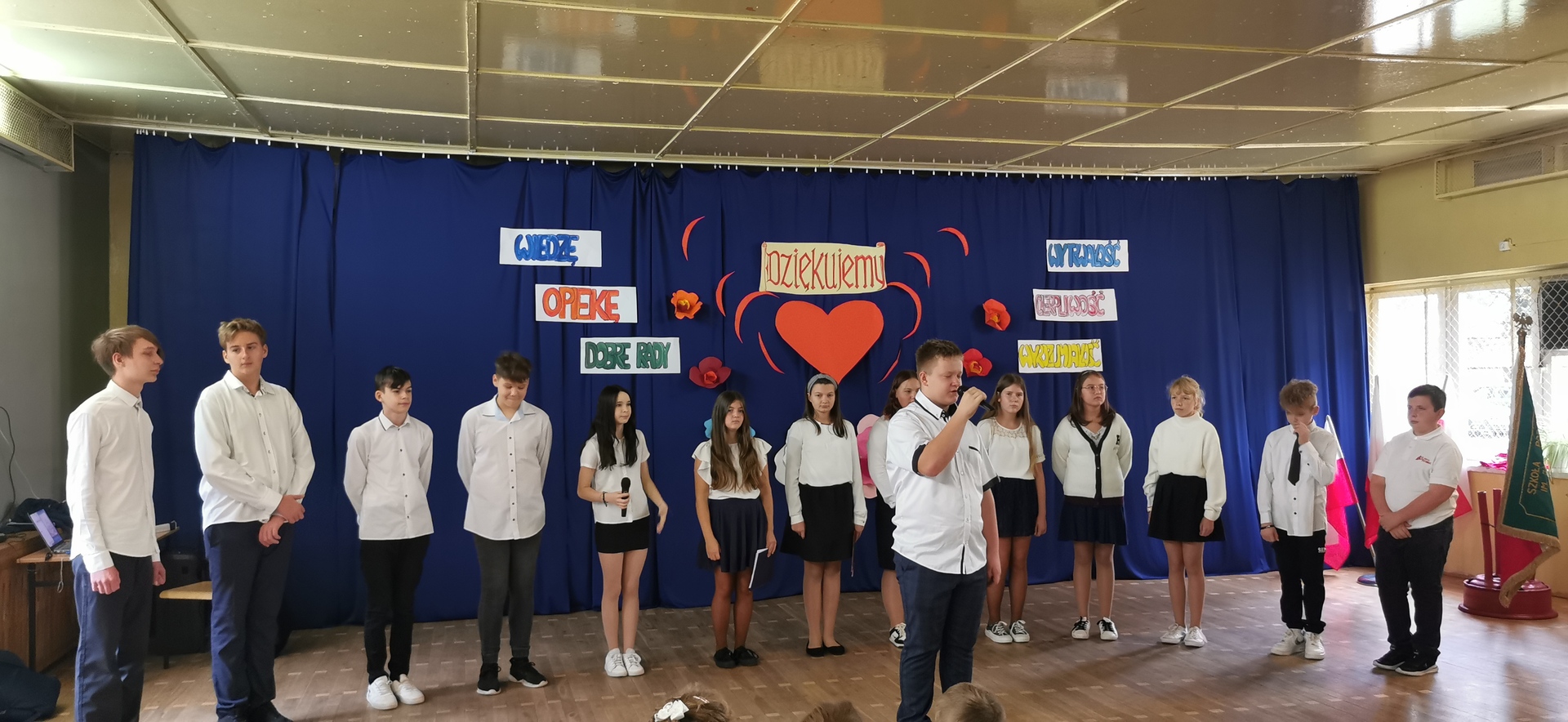 W naszej szkole 250. rocznicę powołania Komisji Edukacji Narodowej upamiętniliśmy 16 października. Z tej okazji społeczność szkolna zebrała się na sali gimnastycznej, by wspólnie uczcić obchody tego święta. Uczniowie klasy VI, VII i VIII wraz z wychowawczyniami - Renatą Borkowską i Bożeną Michniewicz - zaprezentowali program artystyczny o trudach codziennej pracy nauczyciela. Na zakończenie przewodnicząca szkoły poprosiła panią dyrektor o przekazanie władzy i możliwość poprowadzenia lekcji przez uczniów. W ten wyjątkowy sposób uczniowie mieli możliwość podziękować swoim pedagogom. Po akademii Samorząd Uczniowski wręczył kwiaty nauczycielom, a przedstawiciele Rady Rodziców złożyli na ręce pani dyrektor podziękowania i życzenia dla niej samej, pedagogów oraz pozostałych pracowników szkoły.