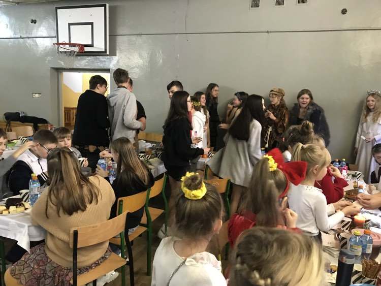 Po zakończeniu przedstawienia uczniowie, nauczyciele i pracownicy szkoły spotkali się przy wigilijnym stole, aby tradycyjnie dzielić się opłatkiem. To symboliczny gest wzmacniający więzi społeczne i przypominające o wartościach świątecznych.